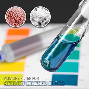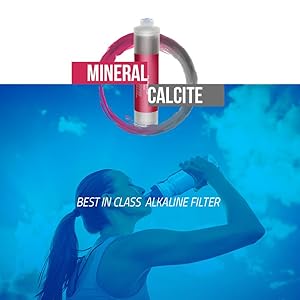 After the reverse osmosis process and before the faucet, the RO water passes through the alkaline re-mineralization filter. The alkaline filter is made up of two sections - half red mineral stone and half calcite. This allows the filter to achieve two specific purposes.